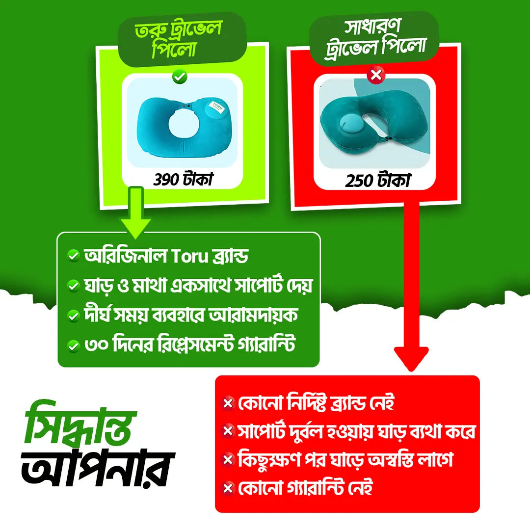 তরু ট্রাভেল পিলো আপনার মাথা এবং ঘাড়কে সাপোর্ট দিয়ে আরামদায়ক ঘুমে সাহায্য করে